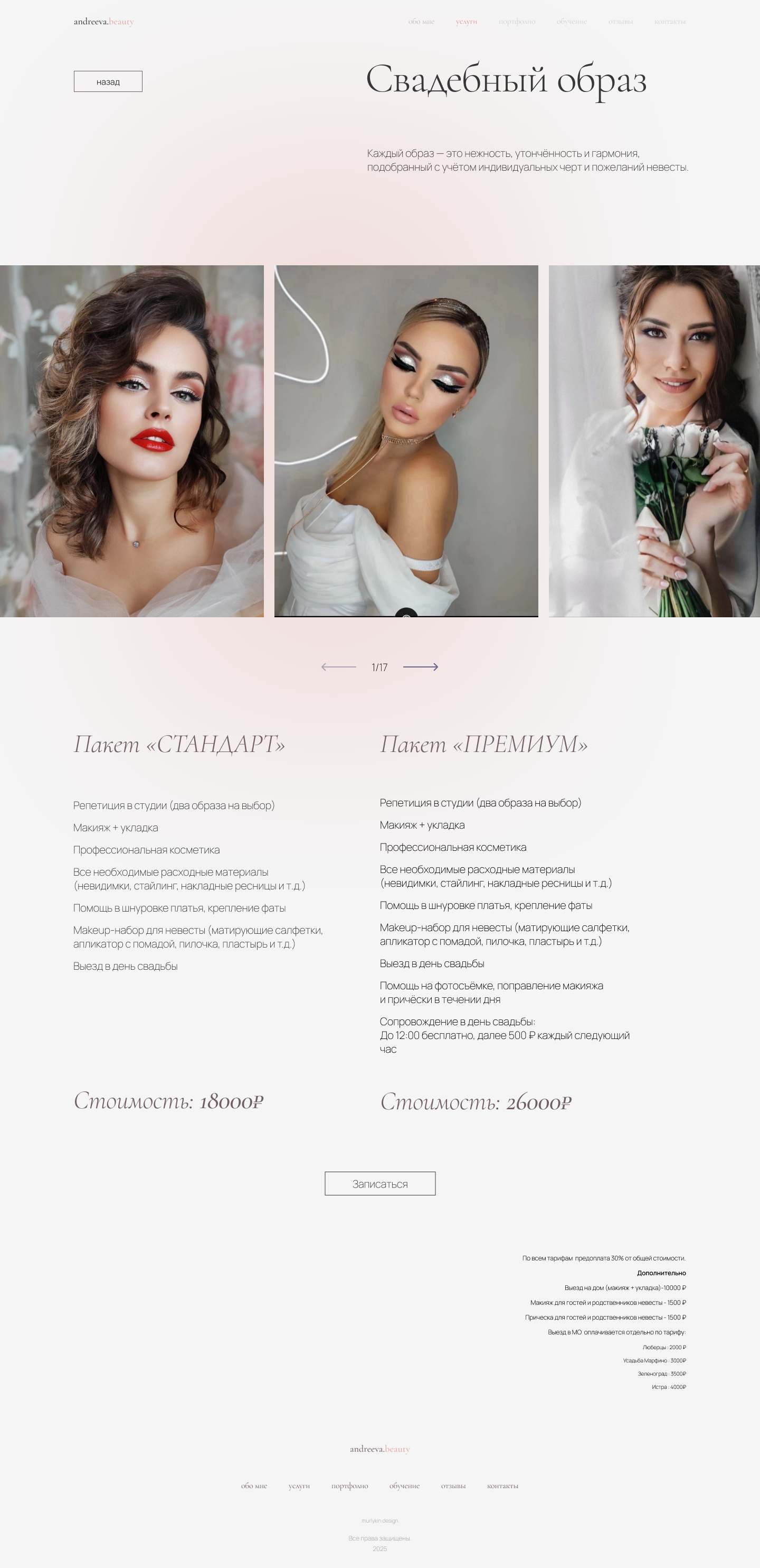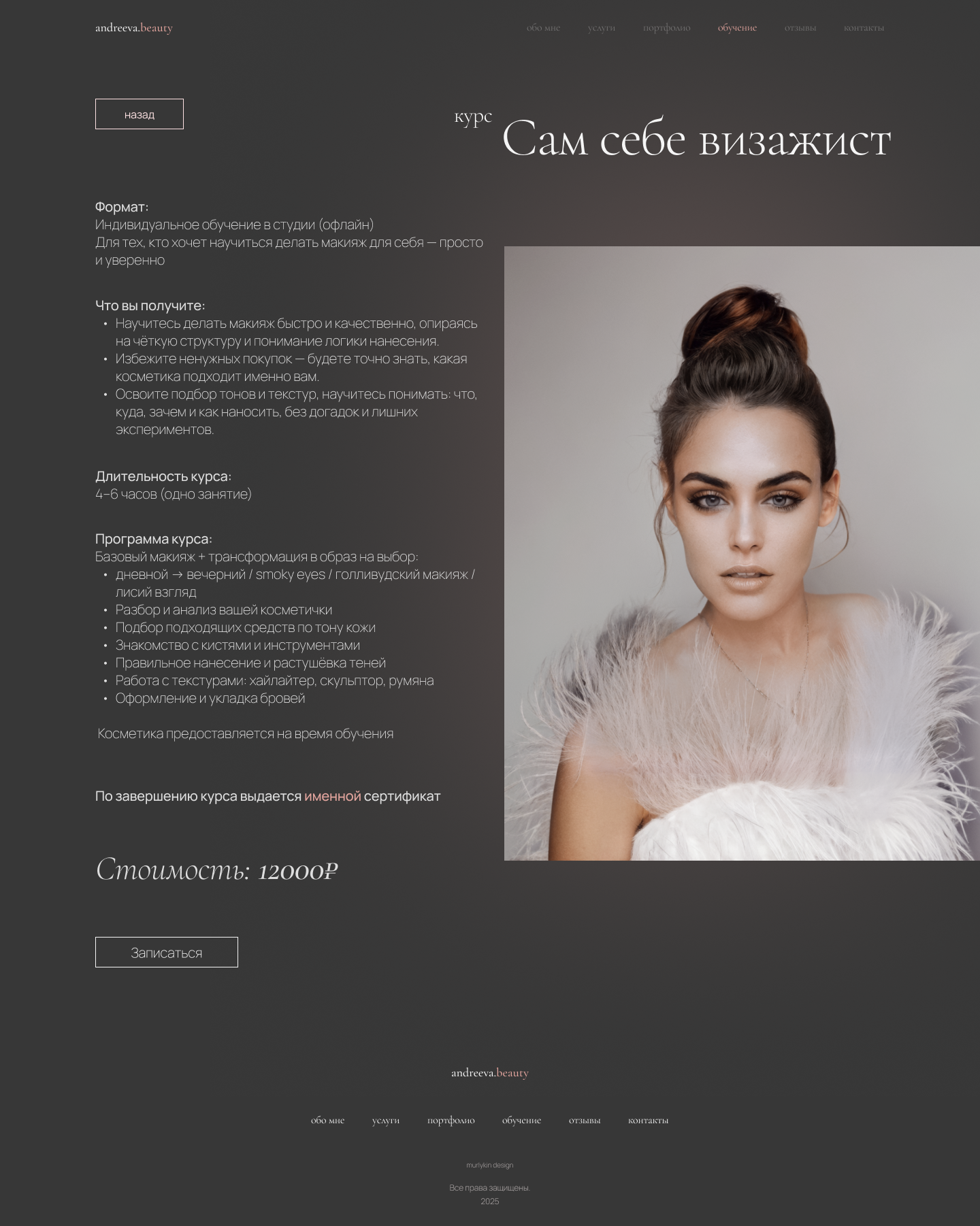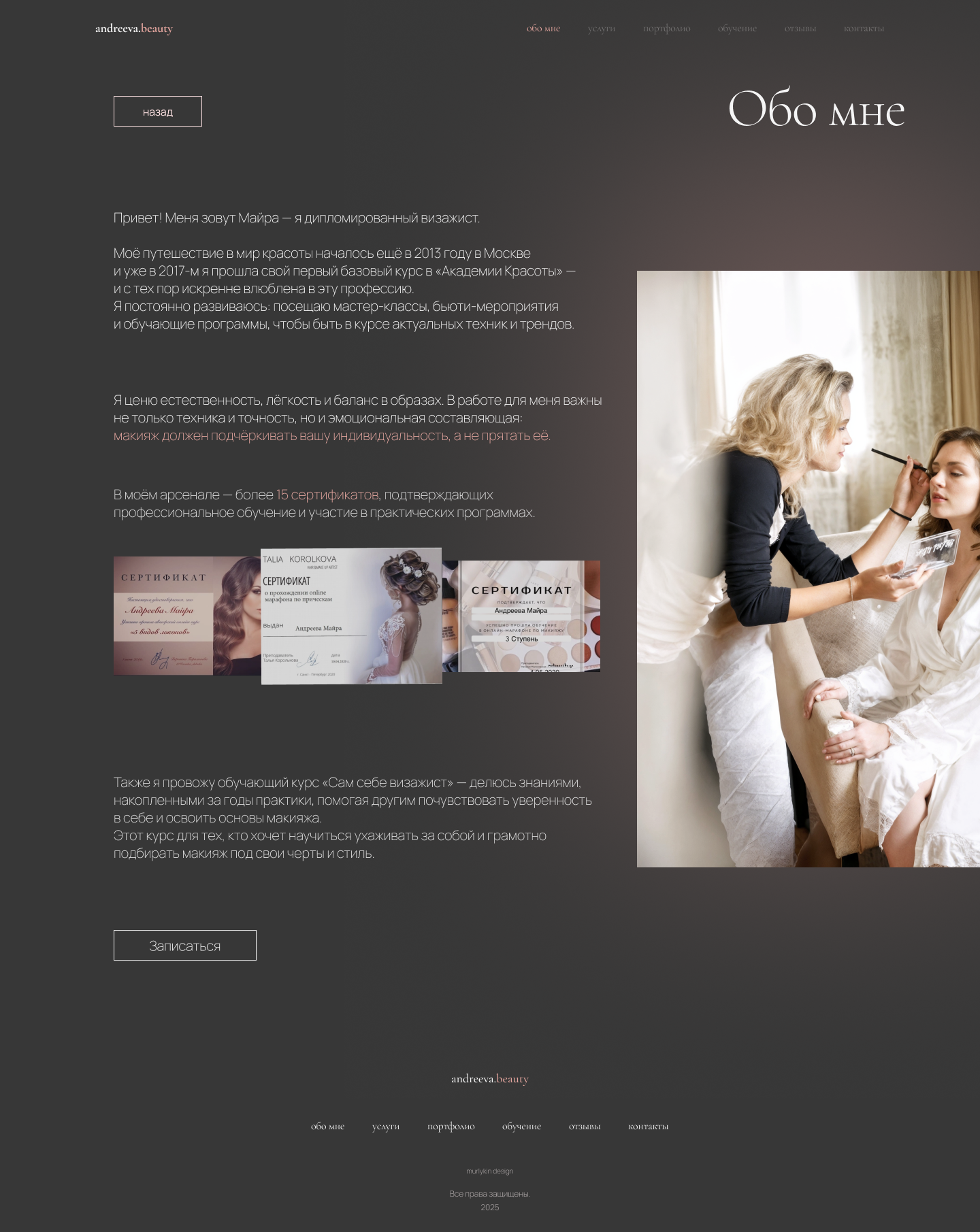 Разработать современный, визуально выверенный и функциональный одностраничный сайт-портфолио для стилиста-визажиста Майры Андреевой с фокусом на продуктовый подход.